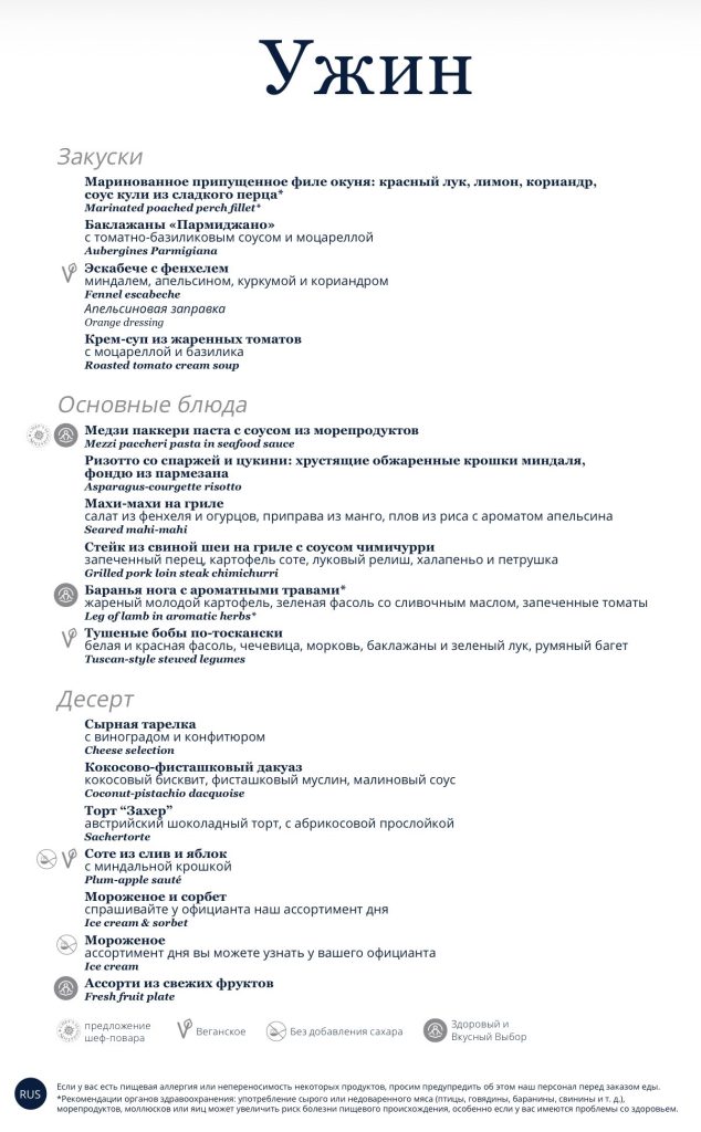 На ужин гости предпочитают ходить в рестораны, где питание по меню. И, кстати, большинство лайнеров MSC Cruises (в том числе и MSC Euribia) русифицированы, так что меню будет на русском языке. Ужин предполагает три смены блюд и сладкое.