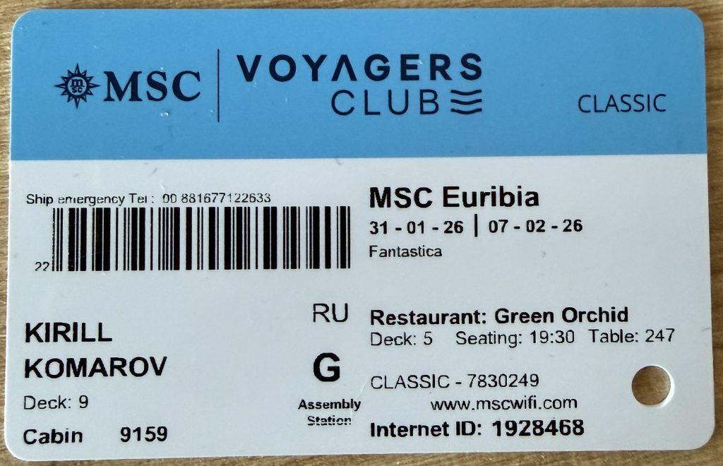 На карте указана вся информация по путешествию: фамилия-имя, название корабля, даты круиза, номер каюты, место встречи в случае экстренной эвакуации, название ресторана на ужин и номер столика, а также пароль от wi-fi (если вы его оплатили). Без этой карты вы не купите ни воду в баре, ни на экскурсию не сходите, так как с корабля без карты не выпустят (при каждом выходе карта сканируется, аналогично и при возвращении).