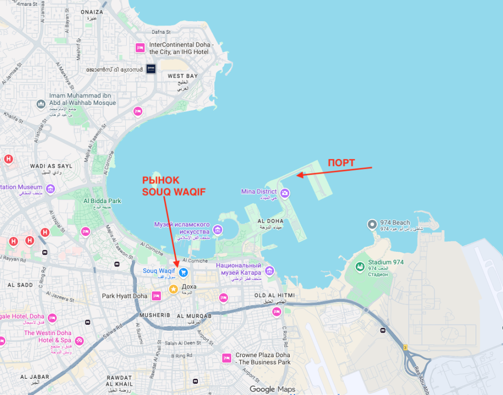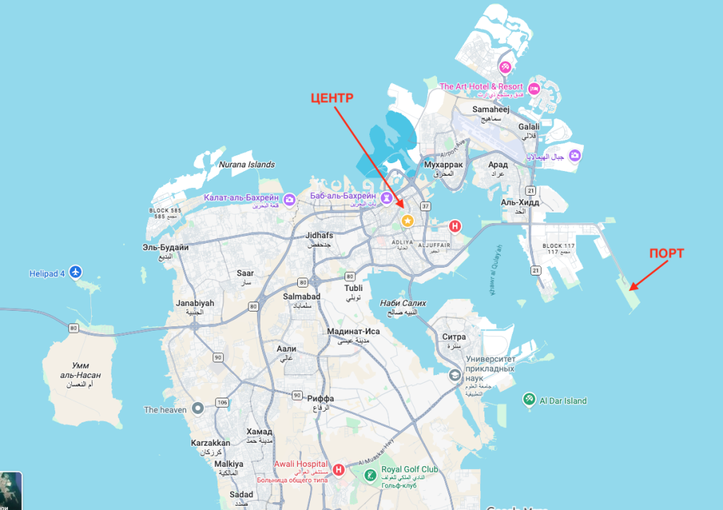 Порт Дохи расположен на полуострове неподалеку от центра столицы Катара. Но расстояние до «города» приличное. Например, до Национального музея Катара (это здание в форме розы пустыни, которое украшает обложки почти всех путеводителей по Катару) — около 4 км, то есть где-то час пешком. Столько же до ближайшей станции метро. До рынка Souq Waqif — самый центр Дохи — около 5 км.
