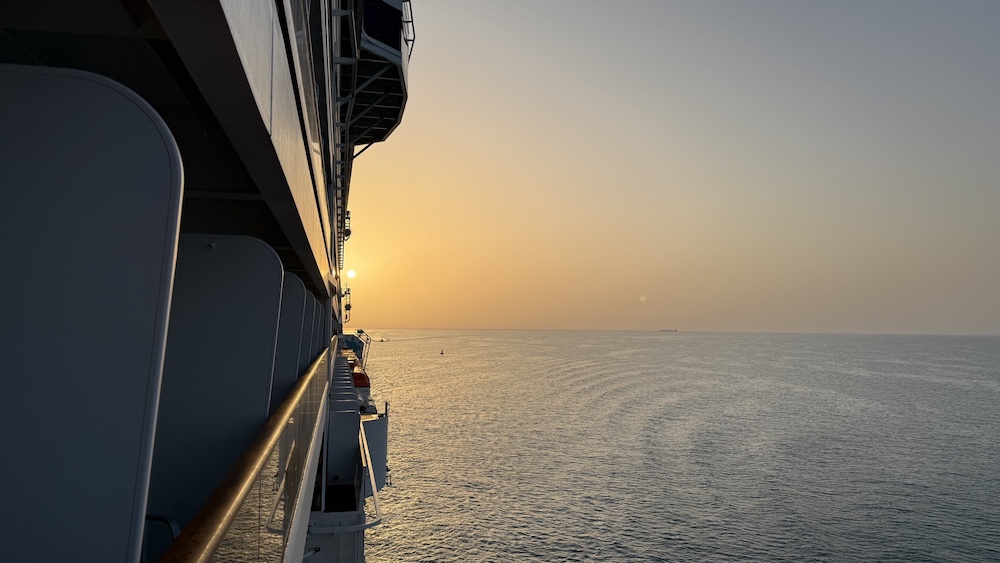 После Бахрейна наш лайнер, плывший до этого на запад, развернулся и взял курс на восток — обратно в ОАЭ. Правда, до Абу-Даби за ночь он не дойдет, поэтому капитан сбросил ход до минимума и весь следующий день мы провели в море по пути к столице ОАЭ.