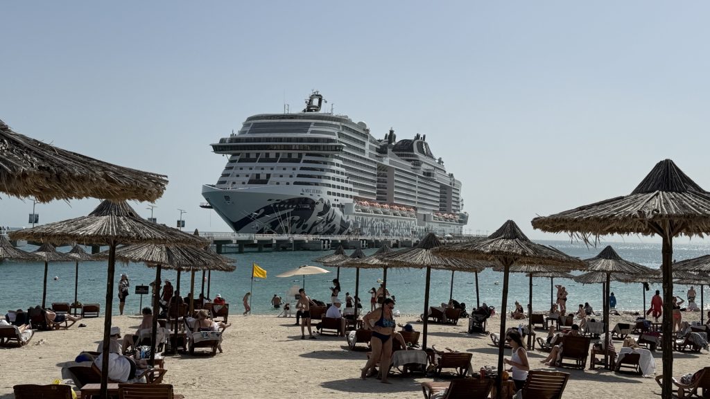 Те, кто не едет, могут целый день нежится на пляже прямо напротив своего лайнера — лежаки и зонтики бесплатны, главное — успеть занять. Обед, кстати, тоже на острове (напитки — тут же, выдают по круизным картам).