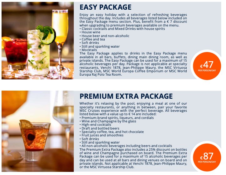 У MSC таких пакетов несколько. Самый дешевый вариант – Easy Package. В него входят самые простые коктейли, типа виски-кола, джин-тоник, вино, пиво и т.п. (коктейли, стоимостью не дороже 7€).