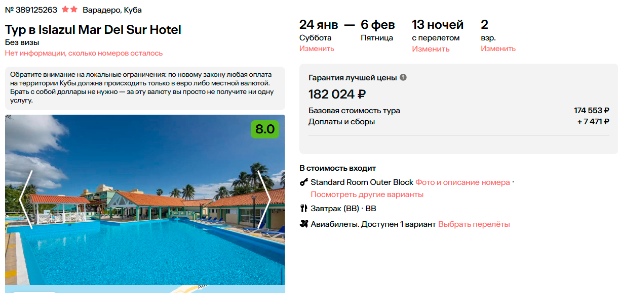 Тур на Кубу (Варадеро) на 13 ночей, вылет 24 января за 127400 на человека.