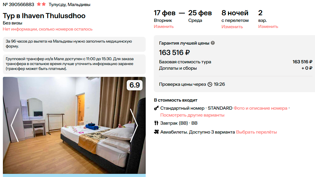 Тур на Мальдивы (Тулусду) на 8 ночей, вылет 17 февраля за 81700 на человека.