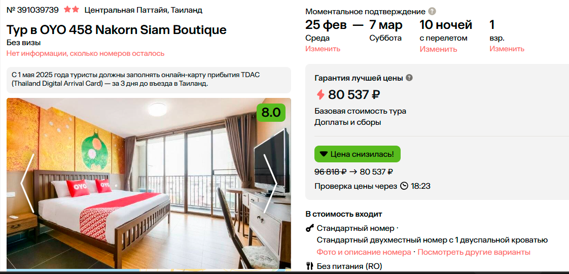 Тур в Таиланд (Центральная Паттайя) на 10 ночей, вылет 25 февраля за 80500 за тур. Отель OYO 458 Nakorn Siam Boutique 2*, можно любой другой отель, но дороже.