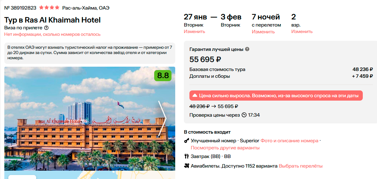 Тур в ОАЭ (Рас-аль-Хайма) на 7 ночей, вылет 24 января за 57700 на человека.